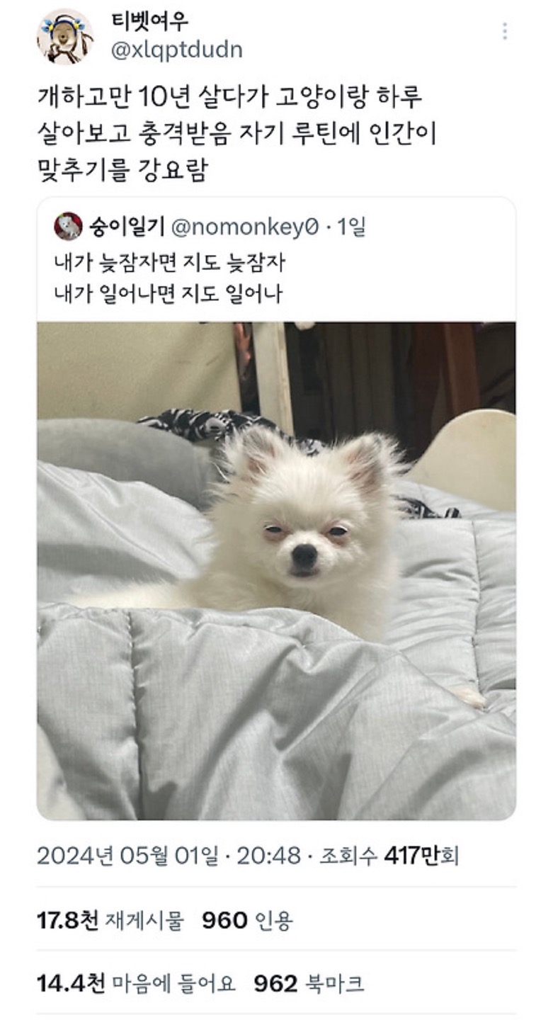 개와 고양이의 차이점 ㅋㅋ 페이지 정보 작성자 피아크 댓글 0건 조회 57회 작성일 24-05-03 14:21 본문 난 고양이상 좋더라 목록 이전글벳위즈 도르트문트 후원경기 및 챔스 경기 이벤트 24.05.03 다음글날씨 너무좋네요 24.05.03 댓글목록 댓글목록 등록된 댓글이 없습니다.