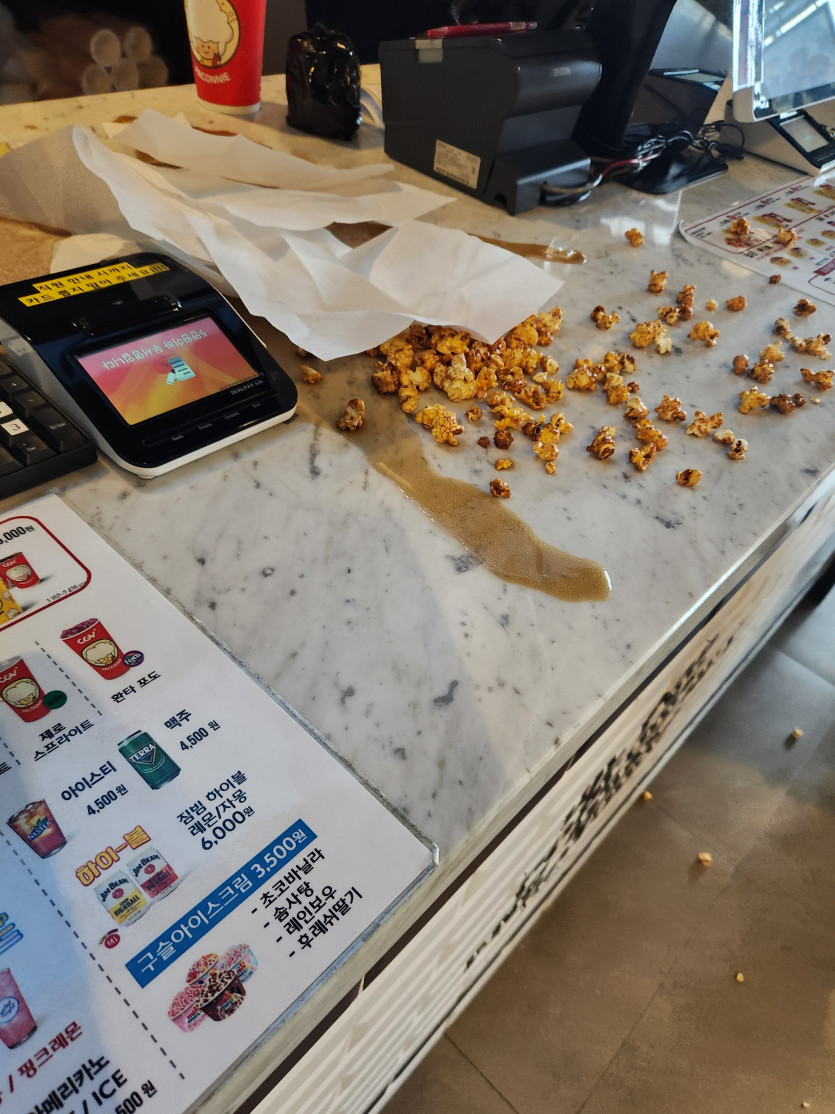 아침엔 팝콘이랑 콜라 다흘리질않나 알바가..