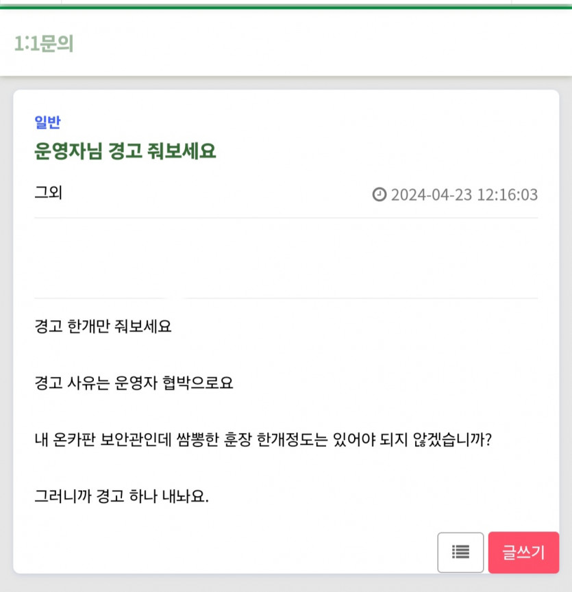 경고 달라고 요청 해봅니다 페이지 정보 작성자 그외 댓글 0건 조회 56회 작성일 24-04-23 12:17 본문 남자는 쌈뽕허게협박으로 훈장 한개 정도는 달아주야지요 목록 이전글맛점하세욤!! 24.04.23 다음글맛있게 점심 드세요 24.04.23 댓글목록 댓글목록 등록된 댓글이 없습니다.