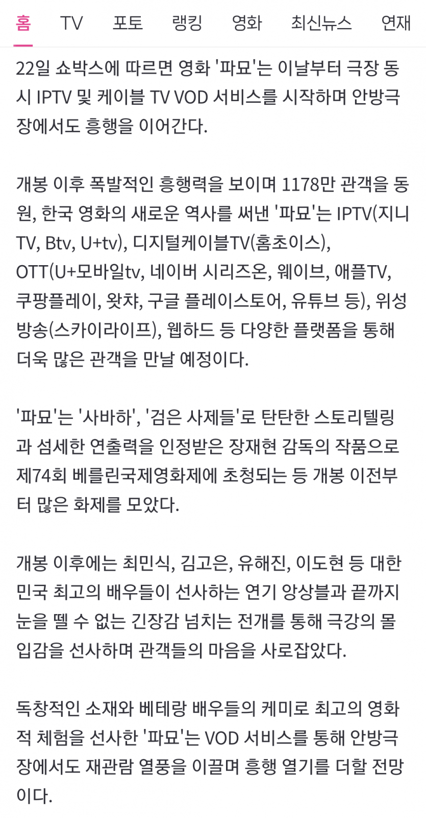 천만 '파묘' 이제 안방 1열서 본다 페이지 정보 작성자 크히히 댓글 0건 조회 73회 작성일 24-04-22 20:50 본문 이제 곧 나오나보네요?! 목록 이전글한국투자공사형님! 24.04.22 다음글난리난 바티칸의 근황 ㄷㄷ 24.04.22 댓글목록 댓글목록 등록된 댓글이 없습니다.