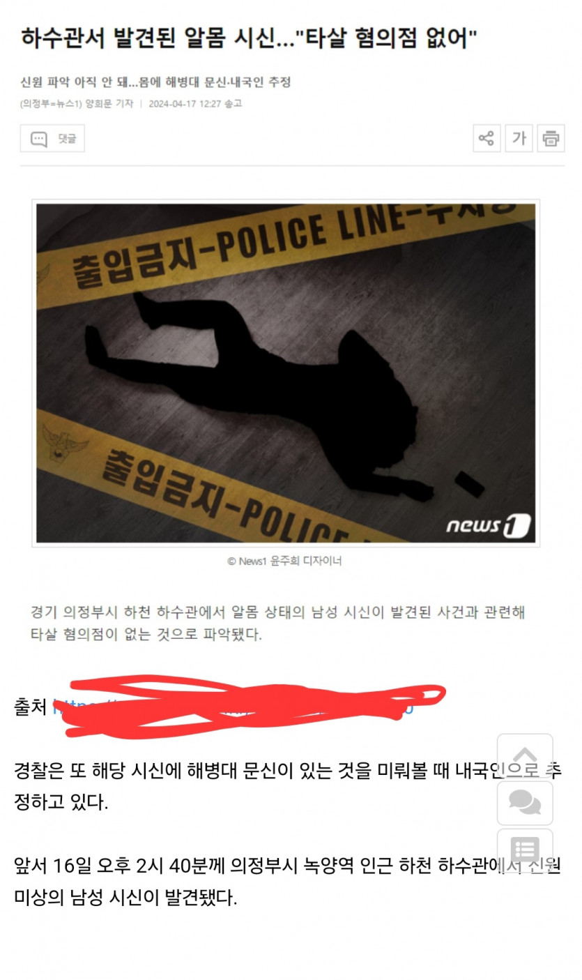 하수관서 발견된 남성 알몸 시신…"타살 혐의점 없어" 페이지 정보 작성자 커커멍 댓글 0건 조회 95회 작성일 24-04-17 18:39 본문 머선일이고 이게.. 목록 이전글아진짜ㅡㅡ 24.04.17 다음글맛저맛저? 24.04.17 댓글목록 댓글목록 등록된 댓글이 없습니다.