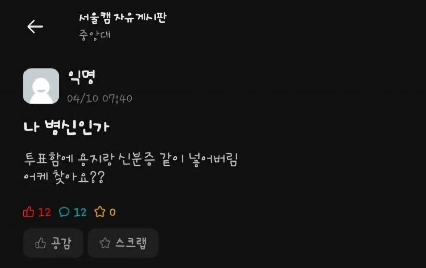 투표 실수한 중앙대생 페이지 정보 작성자 쵸코파이 댓글 0건 조회 84회 작성일 24-04-15 22:08 본문 ㅋㅋㅋ 목록 이전글vpn접속은 24.04.15 다음글다들굿밤하십니까?♥? 24.04.15 댓글목록 댓글목록 등록된 댓글이 없습니다.