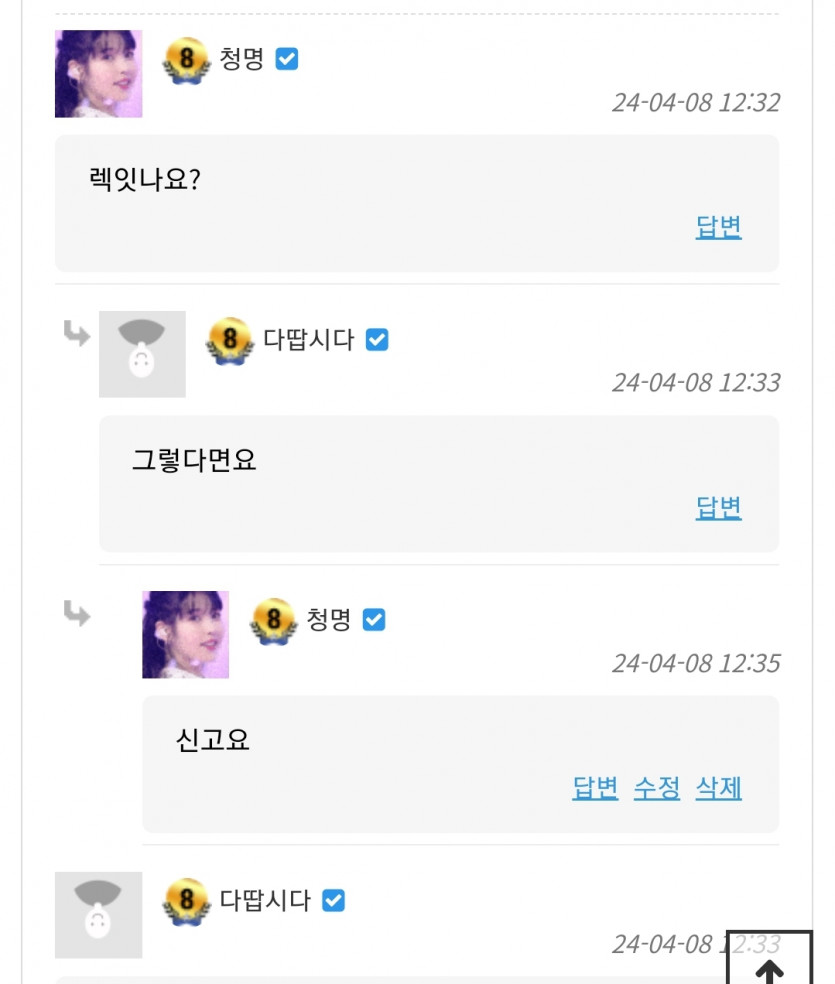 이분 신고함니다 페이지 정보 작성자 청명 댓글 0건 조회 61회 작성일 24-04-08 12:37 본문 댓글마다너무 깐족거리네요분게로 오세요 목록 이전글맛점하세요 ^^ 24.04.08 다음글맛점하세요~ 24.04.08 댓글목록 댓글목록 등록된 댓글이 없습니다.